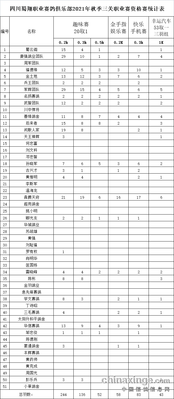 各参赛团队(鸽友):经过认真有序的资格赛各项指定赛的数据统计工作,现将各团队(参赛鸽友)的指定数据公示如下: