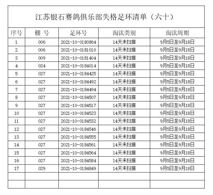 江苏银石赛鸽俱乐部失格足环清单(六十)